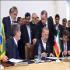 Brazilian President Luiz Inacio Lula da Silva stands beside Turkish Prime Minister ...