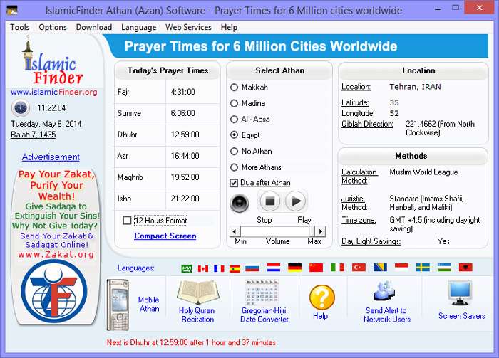 نرم افزار ATHAN (AZAN) BASIC ابزاری برای پخش اتوماتیک اذان و نمایش اوقات شرعی شهرها است. توسط نرم افزار Athan (Azan) Basic می توانید به صورت خودکار و در زمان مناسب صدای اذان را پنج بار در روز و برای هر نماز بشنوید. این نرم افزار دارای دقیق ترین اوقات شرعی، جهت قبله، تقویم هجری اسلامی و بسیاری از صداهای زیبای اذان می باشد. این نرم افزار با تنظیم شهر محل اقامت(دارای لیست کامل شهرهای کشورهان جهان) و انتخاب اذان دلخواه (اذان های مکه، مدینه و یا مسجد الاقصی) در پنج نوبت صبح، ظهر، عصر، مغرب و عشاء اذان بر روی سیستم شما پخش می کند. این نرم افزار این قابلیت را دارد که پس از انتخاب شهر محل اقامت و محاسبه طول و عرض جغرافیایی شهرتان توسط برنامه بتوانید به سادگی جهت قبله را پیدا کنید. این نرم افزار در حال اجرا بسیار سبک می باشد و با نسخه های مختلف ویندوز از جمله ویندوز 8.1 نیز سازگار است.